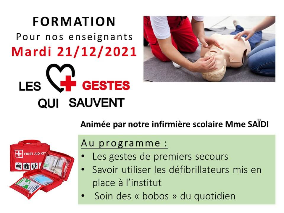 Une formation a été donnée aux enseignants le Mardi 21/12/2021 sur « LES GESTES QUI SAUVENT ».