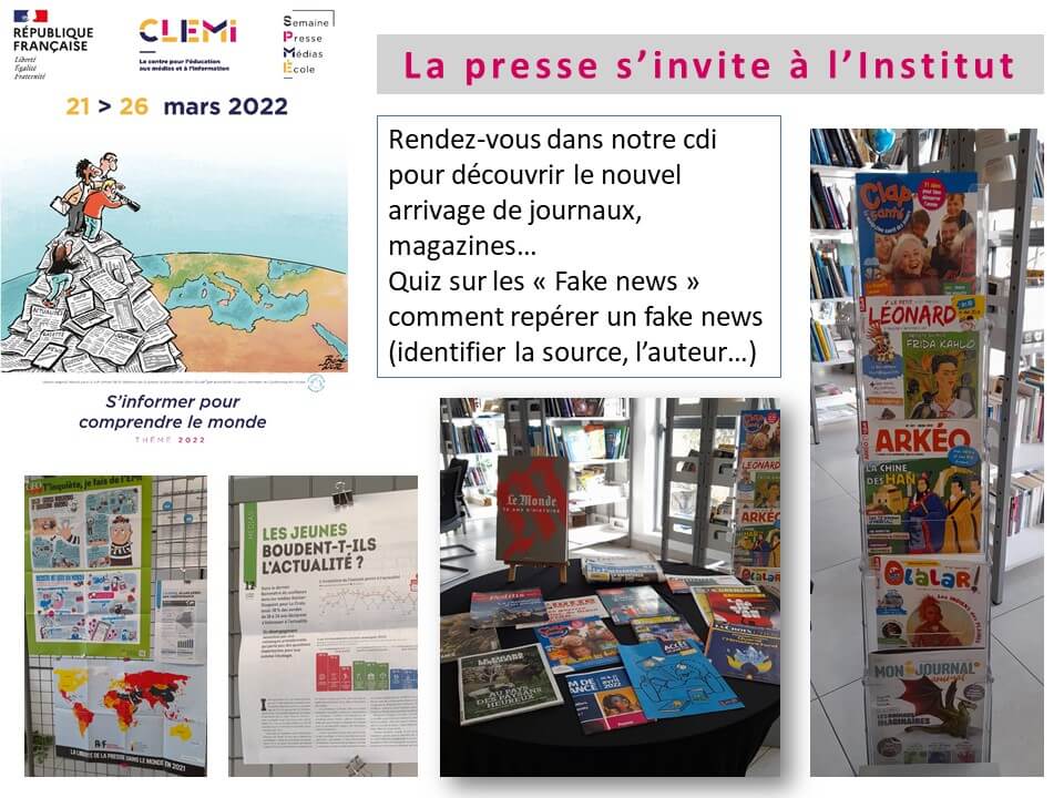 A l’occasion de la 33e Semaine de la presse et des médias dans l’École qui a lieu du 21 au 26 mars 2022, l’Institut en partenariat avec le CLEMI (Centre pour L’Education et la l’Information au Médias) propose aux élèves une exposition dans notre CDI et un atelier autour des « Fake news ».