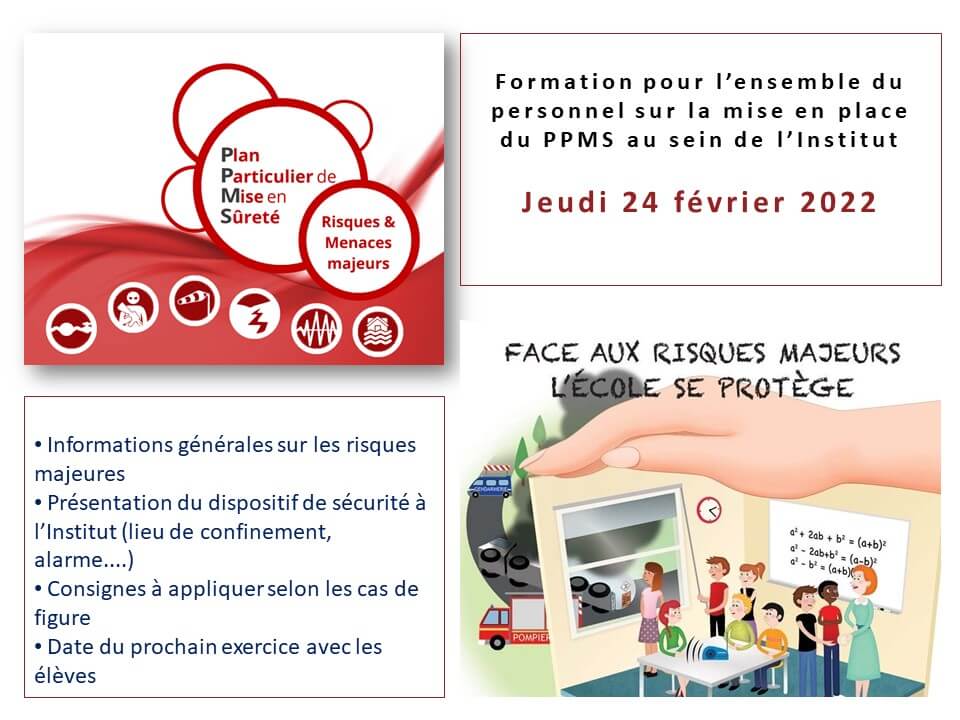 Dans le cadre du dispositif réglementaire sur la sécurité des écoles, une formation de l’ensemble du personnel est prévue le  Jeudi 24/02 10h30-11h30