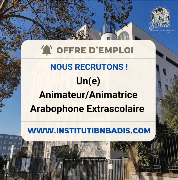 L’Institut Ibn Badis recherche des animateurs/animatrices de cours d’arabe sur le créneau du week-end (tous niveaux, de la grande section maternelle aux adultes)